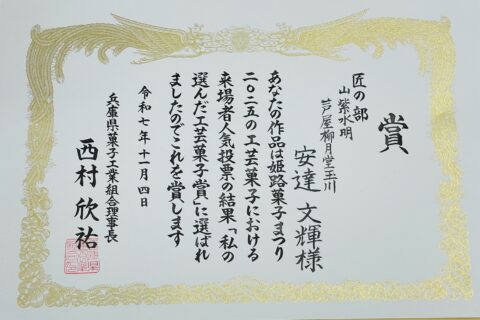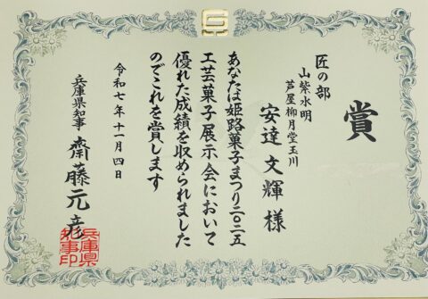 姫路菓子まつりでダブル受賞 2025年11月13日 2025.10/31〜11/4まで開催されました、「姫路菓子まつり」に和風工芸菓子「山紫水明」を出品させていただき、最高賞「兵庫県知事賞」と来場者人気投票「私の選んだ工芸菓子賞」をいただきました。 ご来場いただきましたお客様、関係者の皆様、ありがとうございました。
